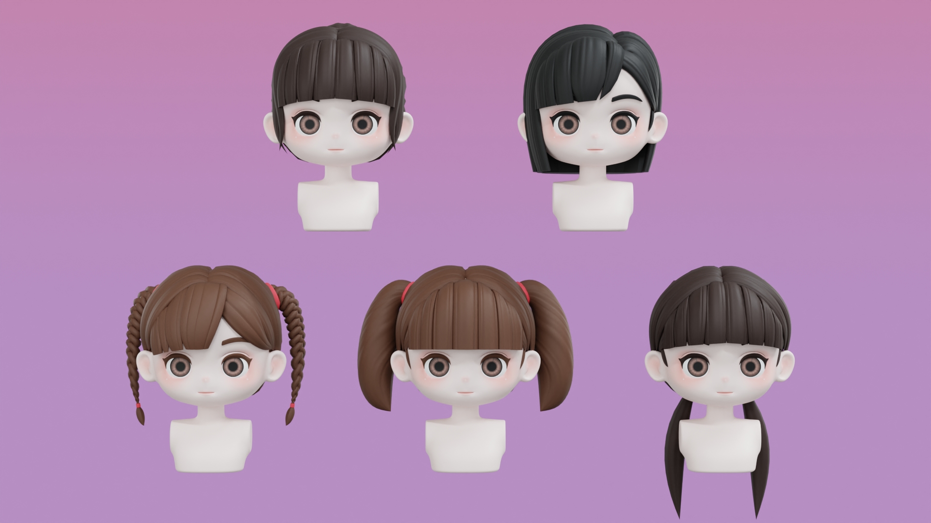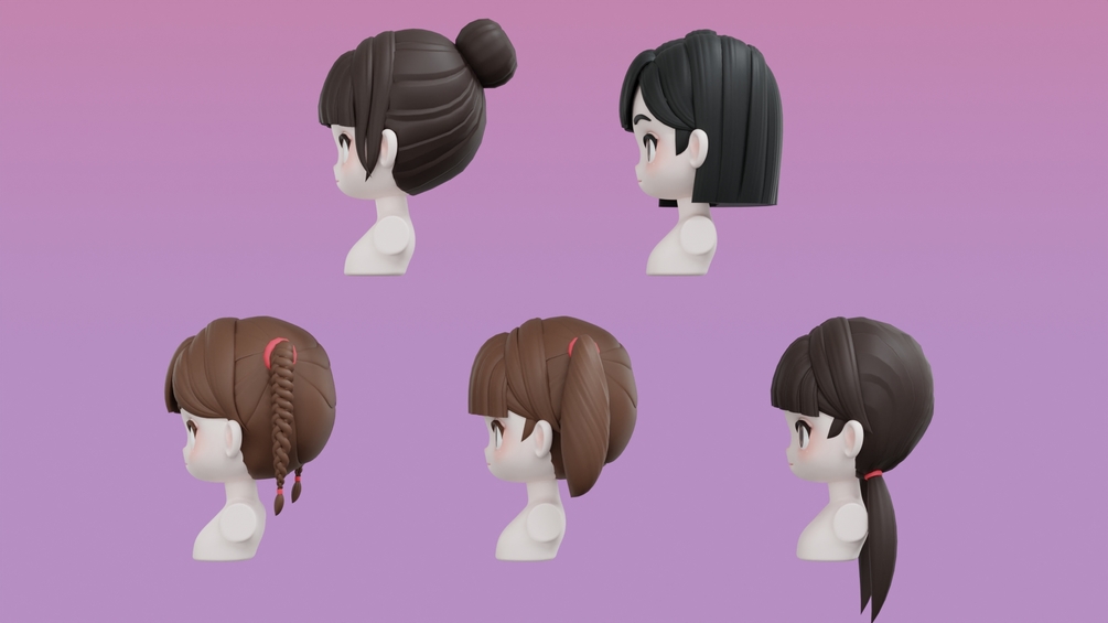 Chibi Female Hair Style 3D Model Set, a delightful collection of five distinct hair styles designed to enhance your chibi-style characters.